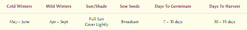 To harvest by the “cut and come again” method: when plants are 4 to 5 in. tall, cut as much as you need, by using scissors to shear off leaves 1 to 2 in. above the soil level. Water well and fertilize lightly and plants will regrow for several more cuttings. These tender, crisp and juicy baby leaves are delicious in fresh salads. Or stirfry, braise or sauté very quickly for healthy, tasty greens.