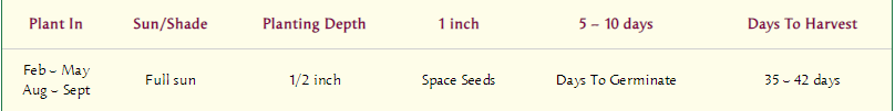 Spinach is most productive grown in cool spring conditions and sown again in late summer for a fall crop. After seedlings reach 2 to 3 inches tall, thin out every other plant (and enjoy in early salads) and keep thinning in this fashion until plants are spaced 5 or 6 inches apart. Keep the shallow-rooted plants well weeded and watered. Spinach is a heavy feeder so fertilize several times with fish emulsion solution for best harvests.
