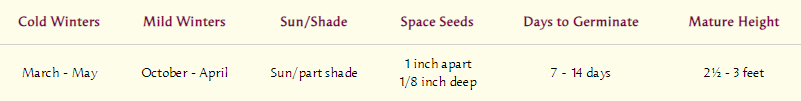 Start seed indoors 4 weeks before last spring frost date. Sow seeds an inch apart in a container of seed starting mix. Cover very lightly, keep evenly moist and provide a strong light source until seedlings are ready to plant outdoors. Plant in the garden when seedlings are large enough to handle. Thin or transplant seedlings 6 inches apart.