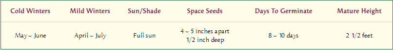 Several weeks before last frost date, sow seeds 1/2 inch deep in individual pots of well drained seed starting mix. Keep moist and provide a strong light source until ready to plant outside only when night temperatures have reached 50-55°F (10-13°C). Transplant carefully into the garden in full sun, disturbing the roots as little as possible.