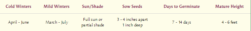 Sow 2 seeds each in individual 4-inch pots of well-drained seed starting mix 3 weeks before last expected frost date. Cover 1 inch deep. Provide a strong light source. When seedlings have several sets of leaves, pinch out the weaker seedling leaving 1 per pot. After outdoor temperatures are evenly above 50°F (10°C) gradually acclimate to outdoor conditions. Transplant seedlings into the garden 10 to 12 inches apart in full sun.