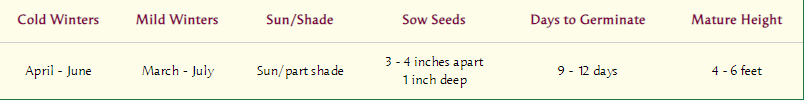 Sow 2 seeds each in individual 4-inch pots of well-drained seed starting mix 3 weeks before last expected frost date. Cover 1 inch deep. Provide a strong light source. When seedlings have several sets of leaves, pinch out the weaker seedling leaving 1 seedling per pot. When weather is evenly in the 50°F (10°C) range, gradually acclimate to outdoor conditions. Transplant 10 to 12 inches apart in full sun.