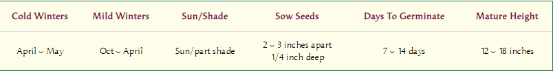 Start seed indoors in a flat or container of seed starting mix, 6 to 8 weeks before last expected hard freeze. Sow seed thinly, cover 1/4 inch deep, and keep moist but not soggy until germination takes place in 7 to 14 days. Provide a strong light source as soon as seedlings emerge. Seedlings grow quickly and require even moisture at their earliest stages: overwatering encourages “damping off,” or rotting at the soil level.
