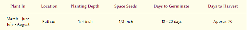 Let these baby carrots color up to orange before harvesting for best flavor. Pull as babies or let fully size up. Sauté or steam just until tender crisp and serve with a squeeze of fresh lemon or lime juice, sweet butter and fresh dill; or try buttered and glazed with a little maple syrup or honey.