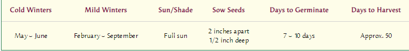In early spring, when danger of frost is over, sow seeds in well-worked, fertile soil in full sun. Sow seeds 1/2 inch deep and 2 inches apart in rows 10 inches apart, or broadcast thinly for bed planting. Firm soil well over these irregularly shaped seeds to ensure good germination. If first sowing germinates unevenly, plant more seed as seedlings catch up quickly. When large enough to handle, thin seedlings to final spacing of 8 to 10 inches apart so these large plants have room to grow and mature. Transplant extras or enjoy young thinnings as early greens and salads.