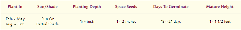 All-purpose heirloom to harvest liberally for its glossy, deep green leaves & sweet full flavor. Use these tasty, nutritious leaves everyday both in salads & to enhance every day cooking. Biennial.
