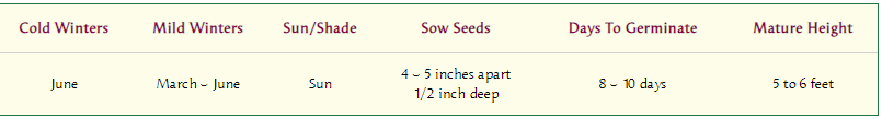 Several weeks before last frost date, sow seeds 1/2 inch deep in individual pots of well-drained seed starting mix. Keep moist and provide a strong light source until seedlings are well established and ready to plant outside. Transplant carefully, disturbing the roots as little as possible. Space seedlings 1 foot apart so plants will have room to mature.