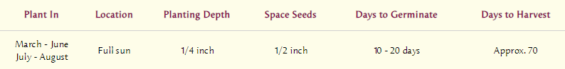 For best sweet flavor, let these pretty, different colored carrots size up and fully mature before harvesting. Enjoy these extra healthy carrots raw as snacks or grated into salads for great eye appeal. Sauté or steam just until tender crisp and serve with a little sweet butter and your favorite fresh chopped herb. Carrots go well with dill, tarragon, chives, cilantro or mint.
